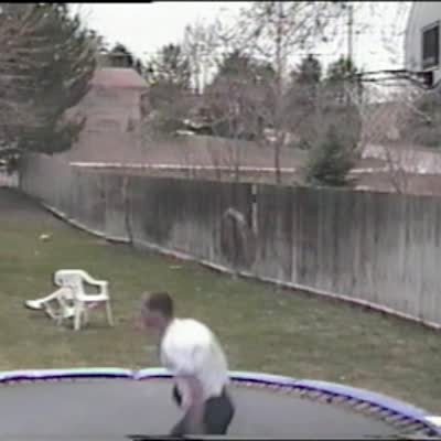 A young boy does a flip on a trampoline in the backyard, but he lands on his head.