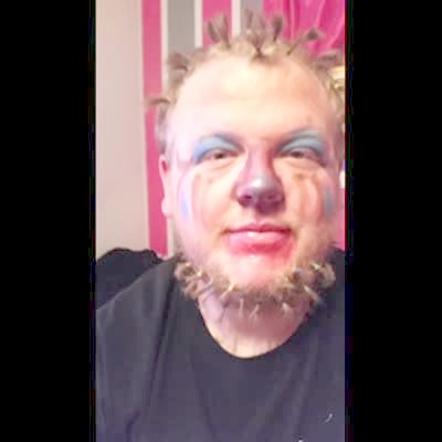 A boy does a trick for the camera in a living room. He moves his hair around without touching it.