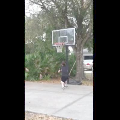 A man throws a football over his house and it goes through a basketball hoop in his backyard.
