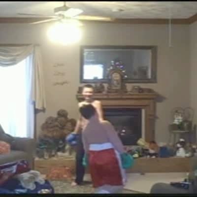 "Rumble In The Rumpus Room" Skinny boy hits chubby boy in the face while boxing in the living room, he knocks him down.