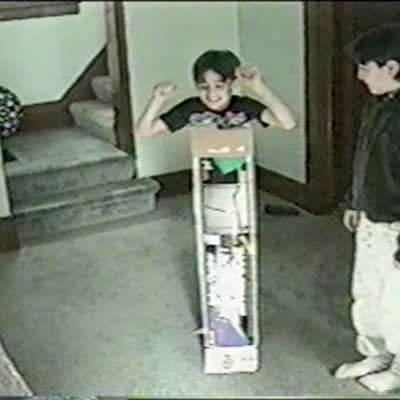 Boy gets stuck inside long skinny cardboard box. He hops around inside it & dances while standing up. Boy in box falls backwards and takes older boy down with him.