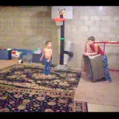 "Hoops, I Did It Again" 3 young boys dunking a basketball on a trampoline. One boy gets bounced up and lands in the hoop.