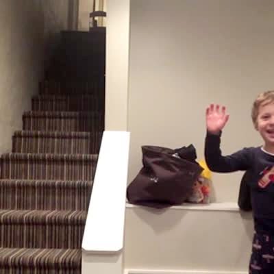 A young boy fails to dunk a ball into a hoop and then the toy hoop falls on him indoors.
