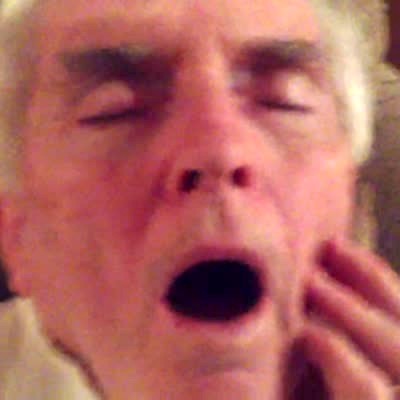 A senior man sleeps on a couch with his mouth open while his family talks around him.