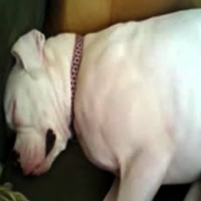 A dog sleeps and shows her teeth, having some sort of dream, amusing the woman behind the camera.