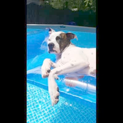 A puppy dog sleeps on a raft in a swimming pool in a yard with two beers on the raft.