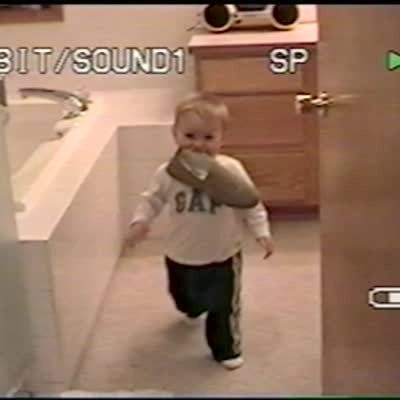Man asks dog to fetch his slippers, dog brings back 1. Giggling tot boy runs in after dog, picks up the slipper with his mouth & brings it to man.