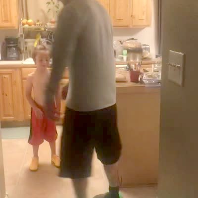 A man spins on a hoverboard in the kitchen, and loses his slippers when he falls off of it. The hoverboard hits the wall, and a whiteboard falls onto a young boy's head.