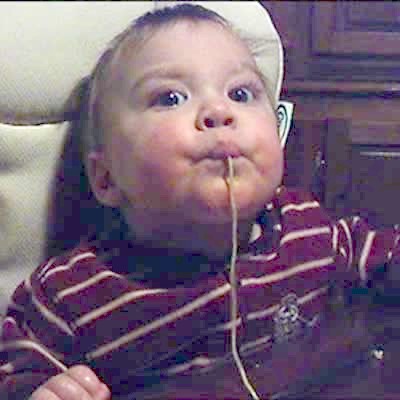 A tot boy presses his face into a bowl of cereal and eats from it in the living room. He pulls on it to pick it up, but it is suctioned to the table. He pulls harder and the bowl comes off the table and spills the milk and cereal on his face.