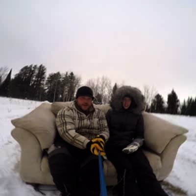 A man records a selfie with a selfie stick while he and a woman ride a couch on skis through the winter snow down a hill. They hit something at the bottom and stop and they both fall forward off the couch.