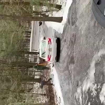 A man walks down a hill in the driveway and slips on winter ice and snow and starts to fall. He runs all the way down the hill to keep his balance and slips and falls at the bottom of the hill.