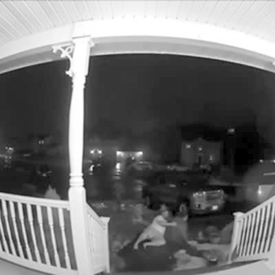 A woman slips on winter snow and ice on the front porch steps and falls. A man runs out after her and he slips and falls too.
