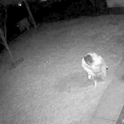 A man jumps over some slush onto his driveway and immediately slips and falls onto his back, cursing to himself as he walks to the house. Security footage.