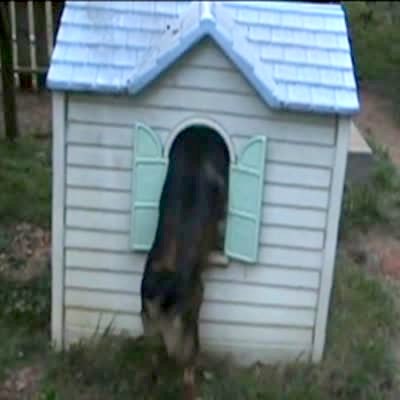 Dog jumps through window of toy playhouse. Woman closes the window & dog jumps out of another window.
