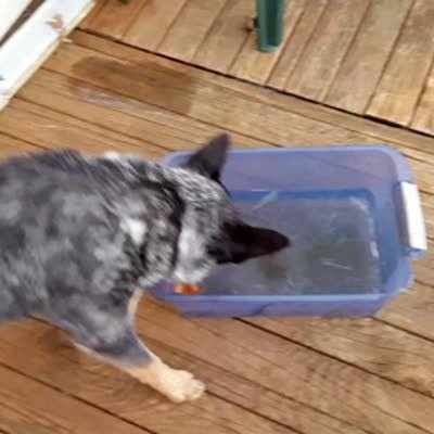 A Blue Heeler dog is unable to get his ball after its been frozen into a container of water outdoors. He carries the container to the porch stairs and drops it down, causing the ice to shatter so he can get his ball in his mouth, even though it's still in a block of ice.