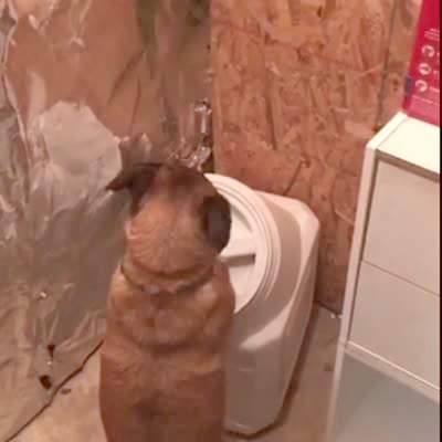 Small dog opens cabinet door, leans it against partition wall & uses it to help him jump over. Silly pet tricks, hidden camera.