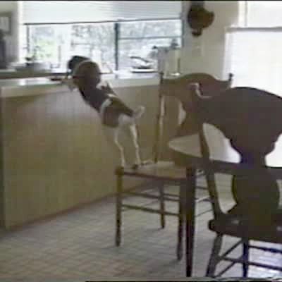 SMART DOG USES CHAIR Beagle dog pushes chair over to kitchen counter to reach plate of food. Smart, silly pet tricks. Hidden camera.