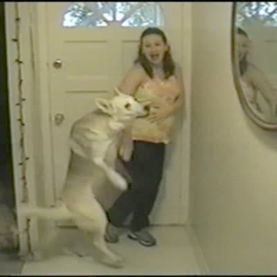 "Canine On The Couch" A man walks through his living room showing a gate to keep a dog away from the couch. As the camera pans up and around the room we see that the dog has made a bridge to get over the gate where the dog is laying comfortably on its back.