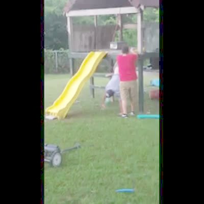 A man tries to get down from a play set in the backyard but he catches his pants on the edge and hangs from them, and another man helps him get down.