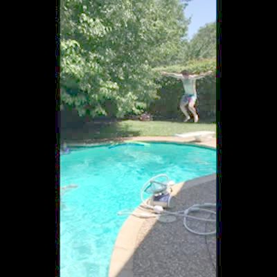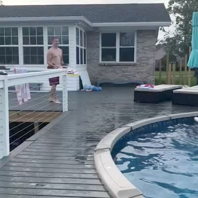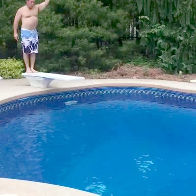 A man jumps on a diving board and it breaks and he falls into the pool. Music rights not cleared.