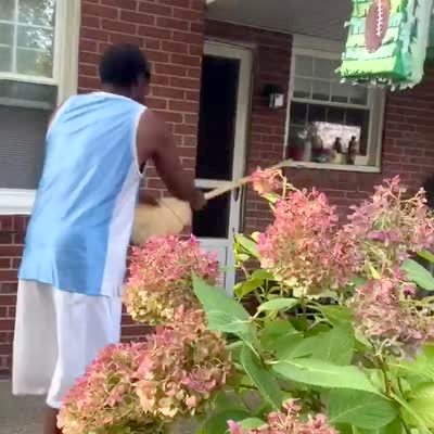 A man hits a piƱata with a broom in the yard, and a young girl tells him to "put some back into it". A young boy then says "more back", and the man snaps the broom.