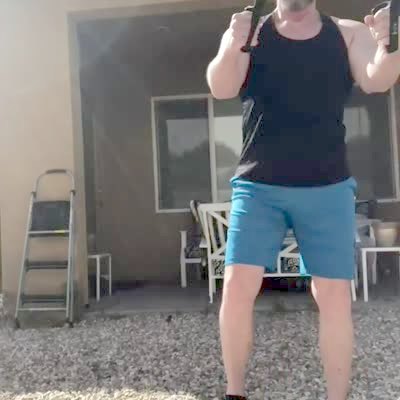A man hits himself in the chest with an elastic band when he does a workout in the yard.
