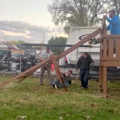 Three men swing on play set then it breaks and they fall to grass. Featured talent cleared only (the four men).