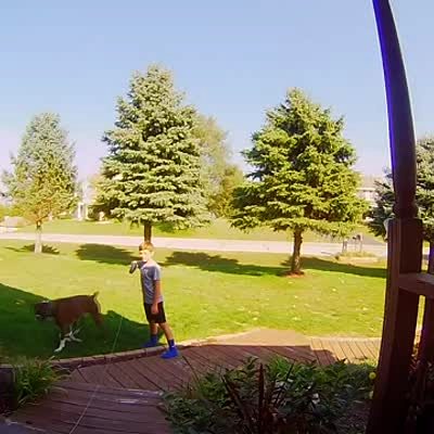 A man standing on his front porch takes his two dogs outside when lightning strikes a tree limb causing it to fall down into the yard. The large branch luckily doesn't hit his nearby dog.