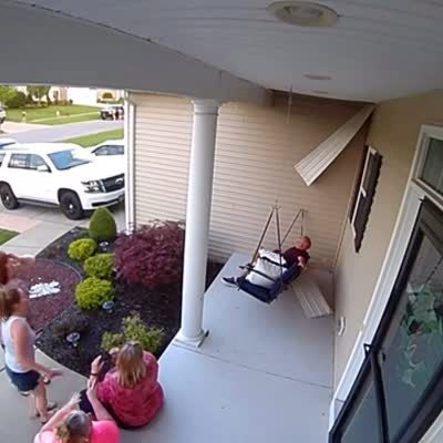 A man attempts to hang a swing on a front porch, when he then attempts to sit in it, it pulls a piece of the ceiling down as he falls onto the porch. Security footage.