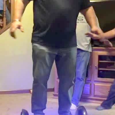 A man attempts to sit back into a folding chair in a living room and topples backwards to the floor. He says "who put this together" and his daughter says she did. He says "I don't think you set it up right." Security footage.