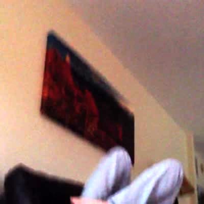 A man tries to attach a bungee cord to a television on the ceiling of a basement. The cord snaps and hits him, and gets caught in the back of his shirt making it difficult for him to get "unstuck." Security footage.