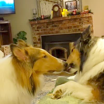 Two dogs lick and press their noses together in a living room. It's a sweet moment, until one places its paw on the other and he snaps at him with his teeth.