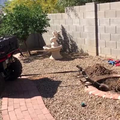 A man uses an ATV to pull a tree stump out of the ground in the yard and the rope snaps off the tree and hits the man in the back.