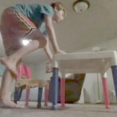 A woman rolls on top of a table and it collapses underneath her in a living room.
