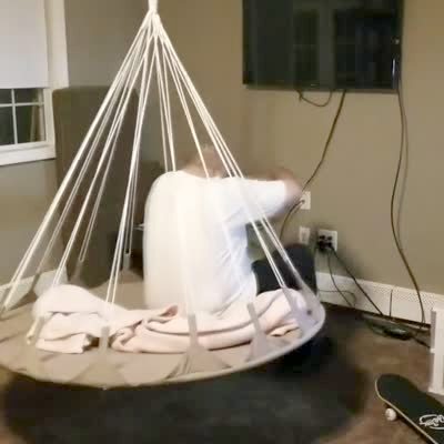A man tries to sit on a round indoor swing and it breaks from the ceiling and falls down.