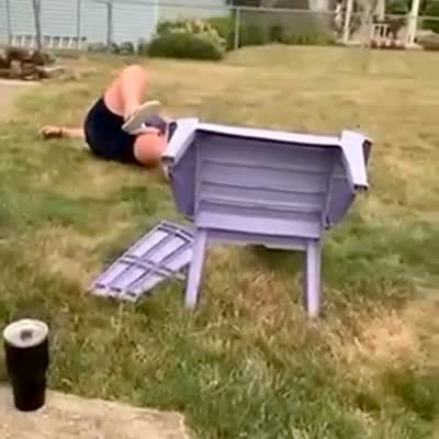 A man sits in a broken plastic lawn chair on a patio. A woman asks him how he will get out of it, and he says "slowly," then he falls on the ground as it breaks further.