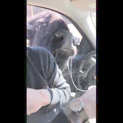 A man drives a car through a safari park and a bison sticks its head through the car window and snorts and blows snot all over the man.