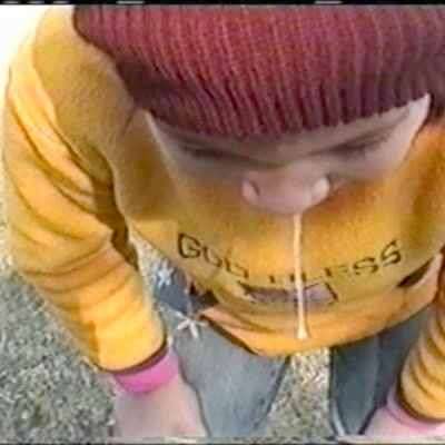 Man films kid playing in the snow, he pans right to show girl with two large snot strings hanging out of her nose.