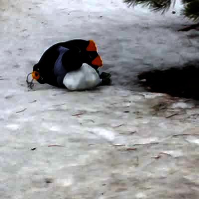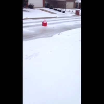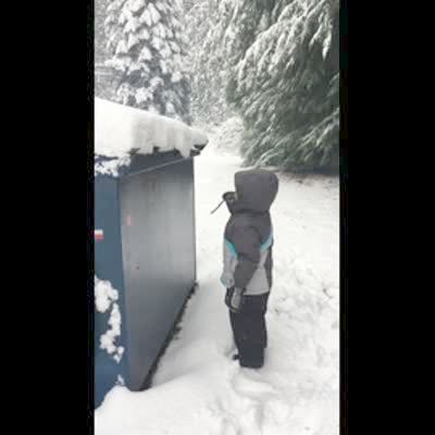 A young boy knocks a block of snow off of the back of a dumpster. The snow flies up into the air and lands on him. Slow motion.