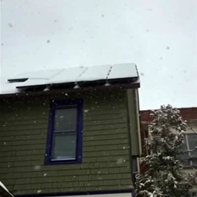A young boy and a young girl wait underneath a slanting roof of a house. In slow motion, snow falls off the roof and lands on them.