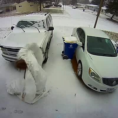A car cover blows around in heavy wind on a driveway, and a woman goes outside to put it away, but the wind makes it crash over onto her. No audio. Security footage.