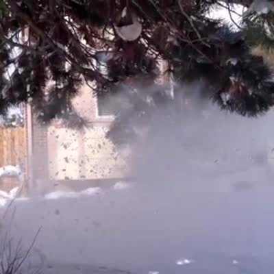 A woman in a car records the snow outside her window with the window open. They pass by a snow blower and the woman gets covered in snow as she screams. The man who drives tells her she should've been more careful.