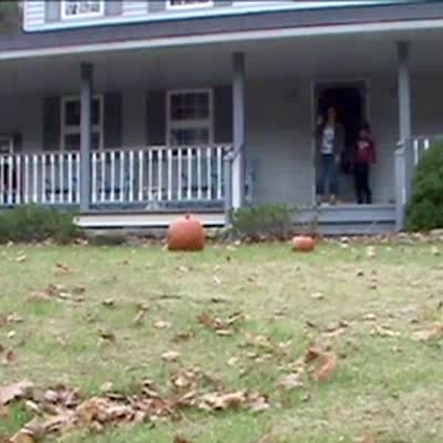 A snow blower hits a cord, flies out of a man's hands on a driveway, and crashes into the house. Security footage.