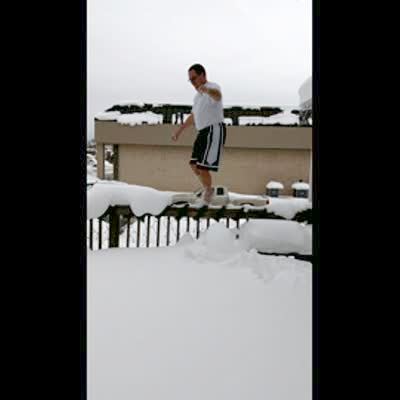 A man climbs up onto a fence around a porch and stands on it and tries to jump but it breaks and he faceplants in the snow and a woman laughs in the backyard.