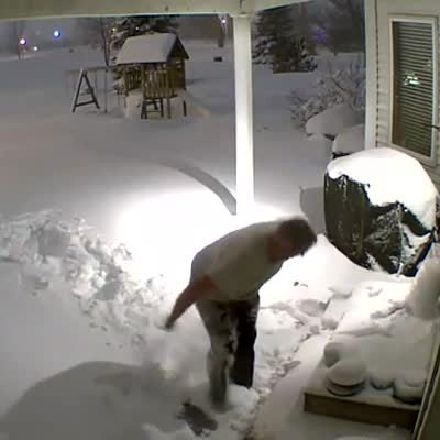 A man shovels snow on the driveway, until a tree branch breaks and dumps snow on the driveway again. Security footage.