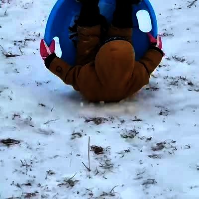 A father pulls a young boy and girl in a sled in the snow. As they sled down a hill the sled gets away from the man and he falls to the ground. A senior woman imitates the face of the girl.