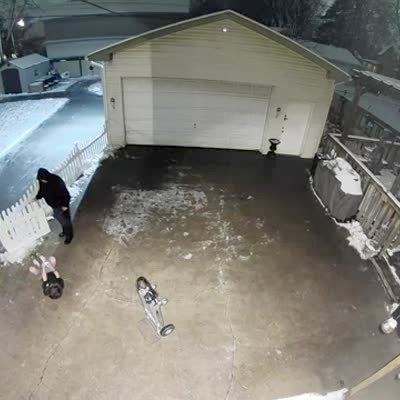 A man slips and falls in the winter snow in the driveway as comes home. Security footage.