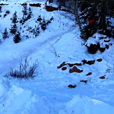 A man exploring a frozen waterfall with his dog slips and falls before sliding down the ice towards the camera.