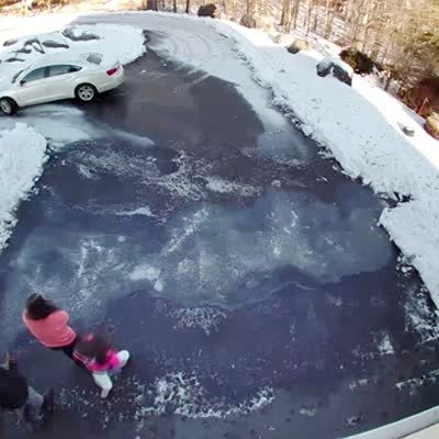 A teen boy sneaks up behind a man to scare him when he falls on the ice and hurts himself. Security footage.
