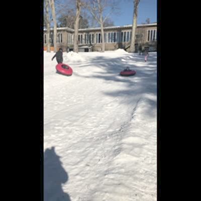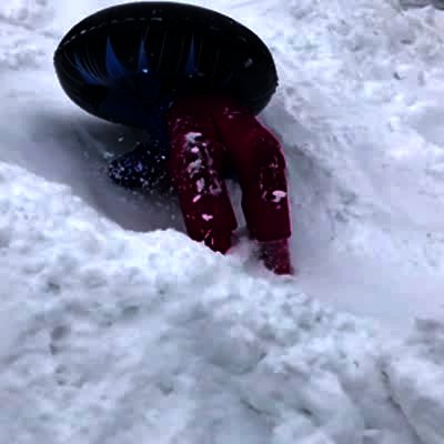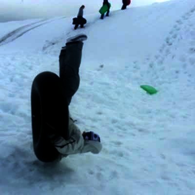 Snow Fall. Kid runs to jump on inner tube, falls face first in the snow.